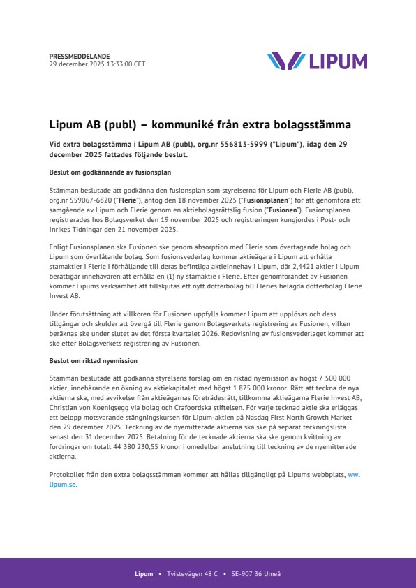 Stämman beslutade att godkänna den fusionsplan som styrelserna för Lipum och Flerie AB (publ), org.nr 559067-6820 (”Flerie”), antog den 18 november 2025 (”Fusionsplanen”) för att genomföra ett samgående av Lipum och Flerie genom en aktiebolagsrättslig fusion (”Fusionen”). Fusionsplanen registrerades hos Bolagsverket den 19 november 2025 och registreringen kungjordes i Post- och Inrikes Tidningar den 21 november 2025.