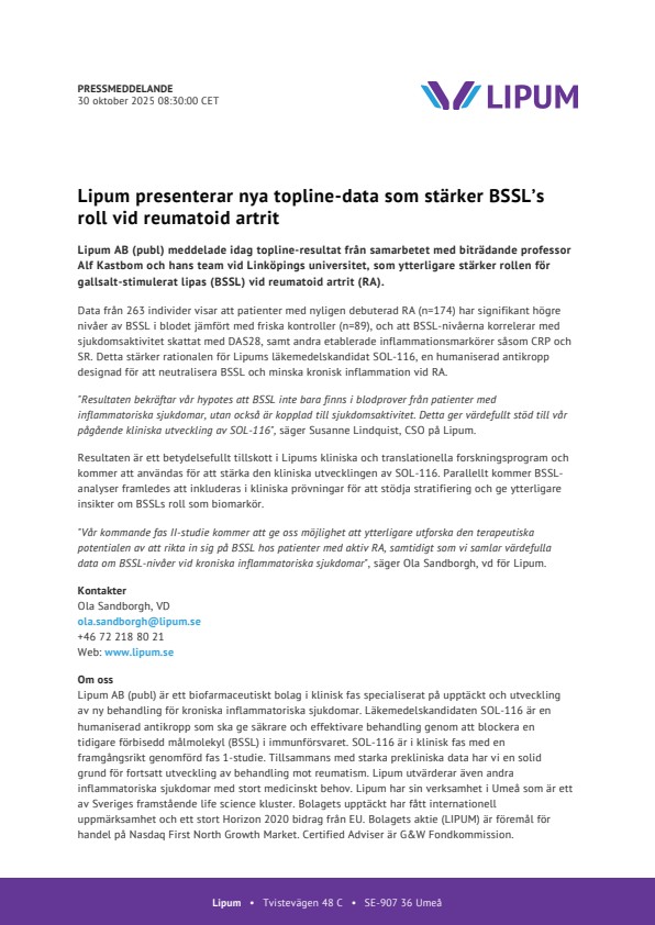 Data från 263 individer visar att patienter med nyligen debuterad RA (n=174) har signifikant högre nivåer av BSSL i blodet jämfört med friska kontroller (n=89), och att BSSL-nivåerna korrelerar med sjukdomsaktivitet skattat med DAS28, samt andra etablerade inflammationsmarkörer såsom CRP och SR. Detta stärker rationalen för Lipums läkemedelskandidat SOL-116, en humaniserad antikropp designad för att neutralisera BSSL och minska kronisk inflammation vid RA.