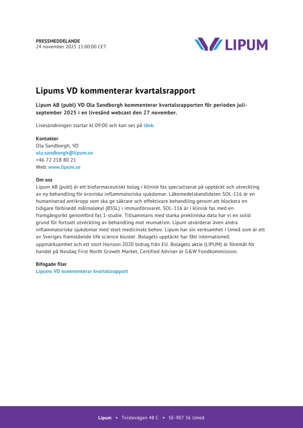 Lipum AB (publ) VD Ola Sandborgh kommenterar kvartalsrapporten för perioden juli- september 2025 i en livesänd webcast den 27 november.
