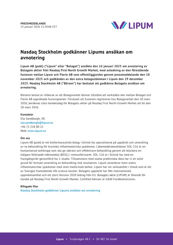Lipum AB (publ) (”Lipum” eller ”Bolaget”) ansökte den 16 januari 2025 om avnotering av Bolagets aktier från Nasdaq First North Growth Market, med anledning av den förestående fusionen mellan Lipum och Flerie AB som offentliggjordes genom pressmeddelande den 18 november 2025 och godkändes av den extra bolagsstämman i Lipum den 29 december 2025. Nasdaq Stockholm AB (”Börsen”) har beslutat att godkänna Bolagets ansökan om avnotering.