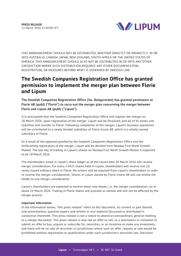 It is anticipated that the Swedish Companies Registration Office will register the merger on 20 March 2026. Upon registration of the merger, Lipum will be dissolved, and all of its assets and liabilities will transfer to Flerie. Following completion of the merger, Lipum’s business operations will be contributed to a newly formed subsidiary of Flerie Invest AB, which is a wholly owned subsidiary of Flerie.